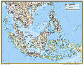 This detailed wall map of Southeast Asia by National Geographic includes Indonesia, New Guinea, the Phillipines, Malaysia, Thailand, Myanmar, Cambodia and Vietnam.